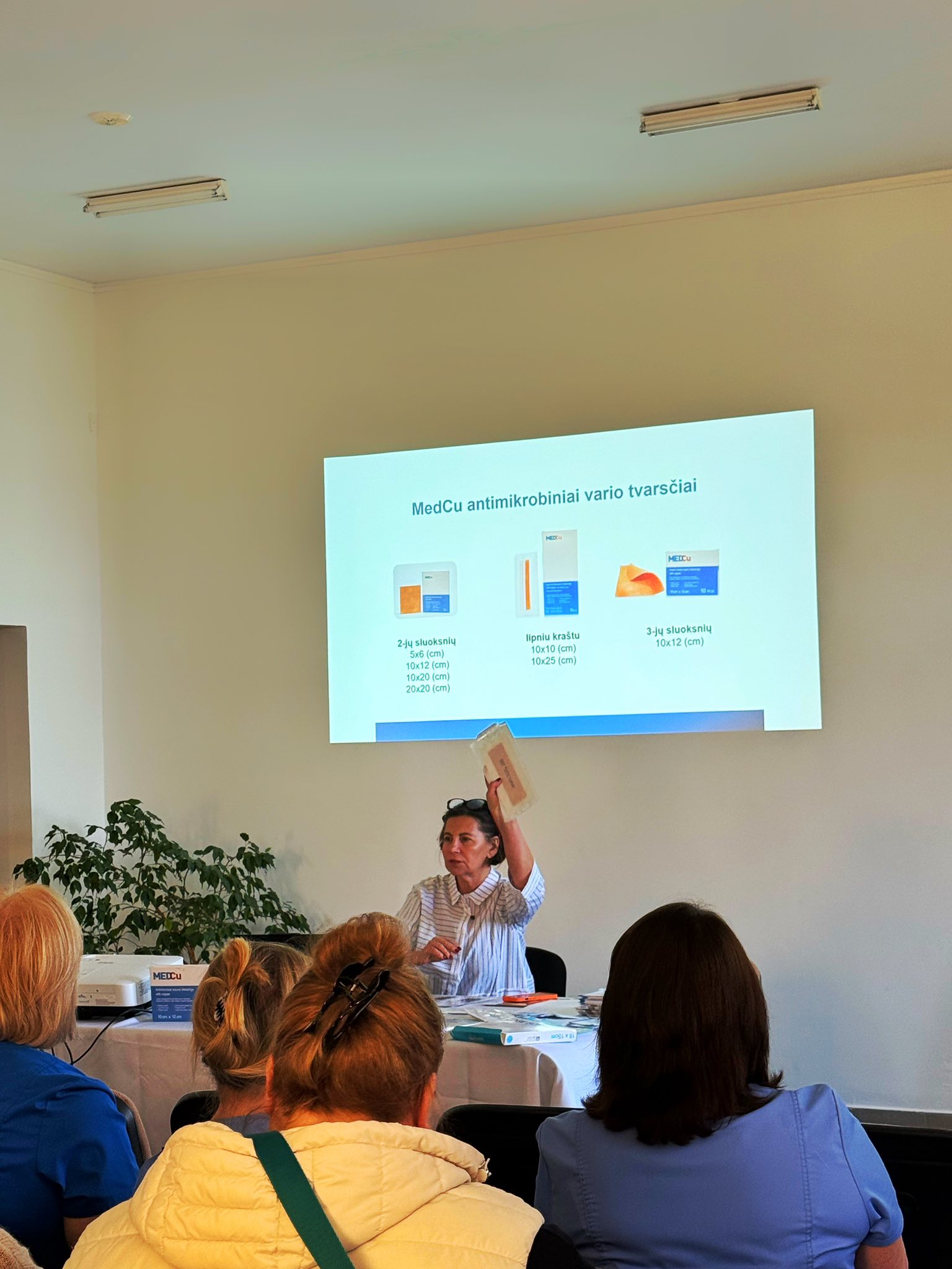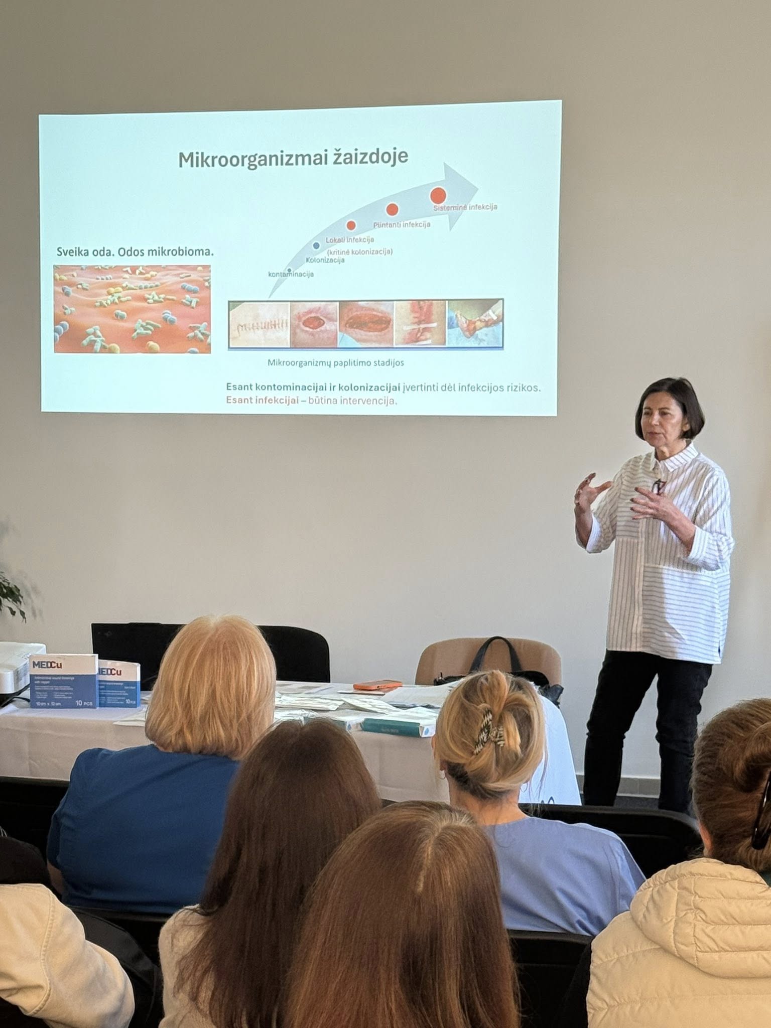 Paskaitos metu buvo pristatytos pažangios technologijos ir sprendimai, padedantys efektyviau kovoti su infekcijomis bei skatinti žaizdų gijimą. Viena iš aptartų naujovių – antimikrobiniai vario tvarsčiai, pasižymintys plataus spektro poveikiu prieš bakterijas, virusus ir grybelius. Varis ne tik padeda mažinti infekcijų riziką, bet ir aktyviai prisideda prie gijimo proceso.
